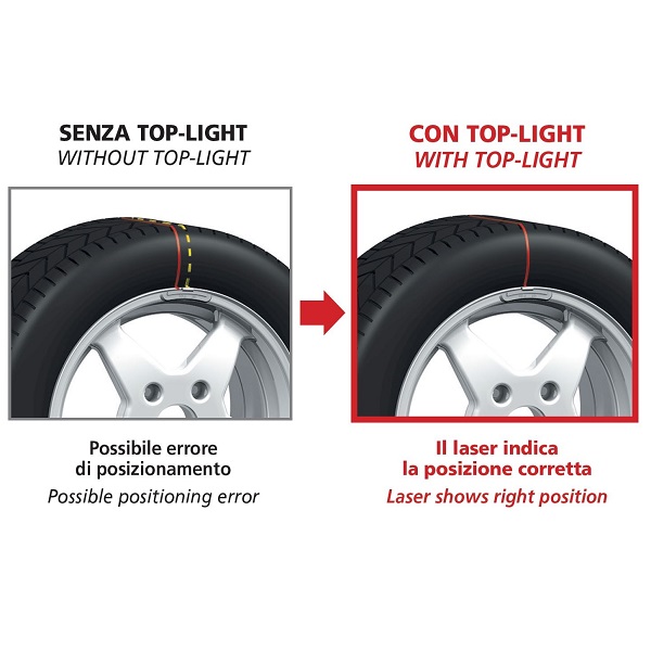 control of the geometry of the tire and rim, G3.Extrem electronics for maximum working speed. It also comes with TOP-LIGHT above the machine, with two led lights points to improve brightness in the working area, and two lasers to show with great accuracy the position of the weight to be applied on the tire clothespin. The new layout of the control Pneu-Lock and Brake, with two new pedals, increases ease of use.