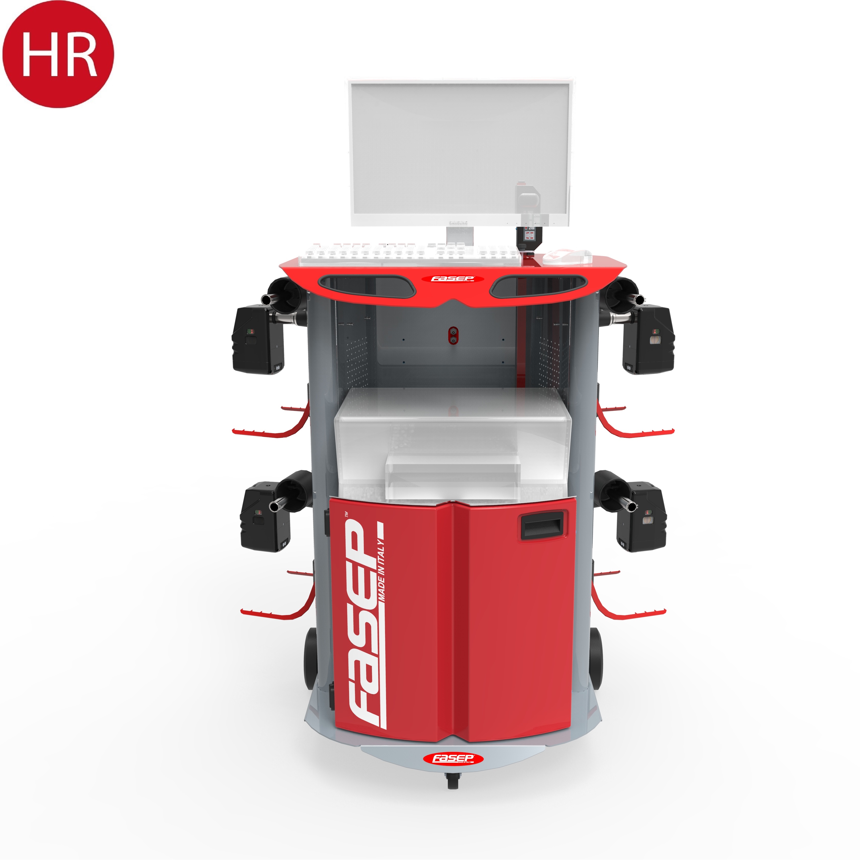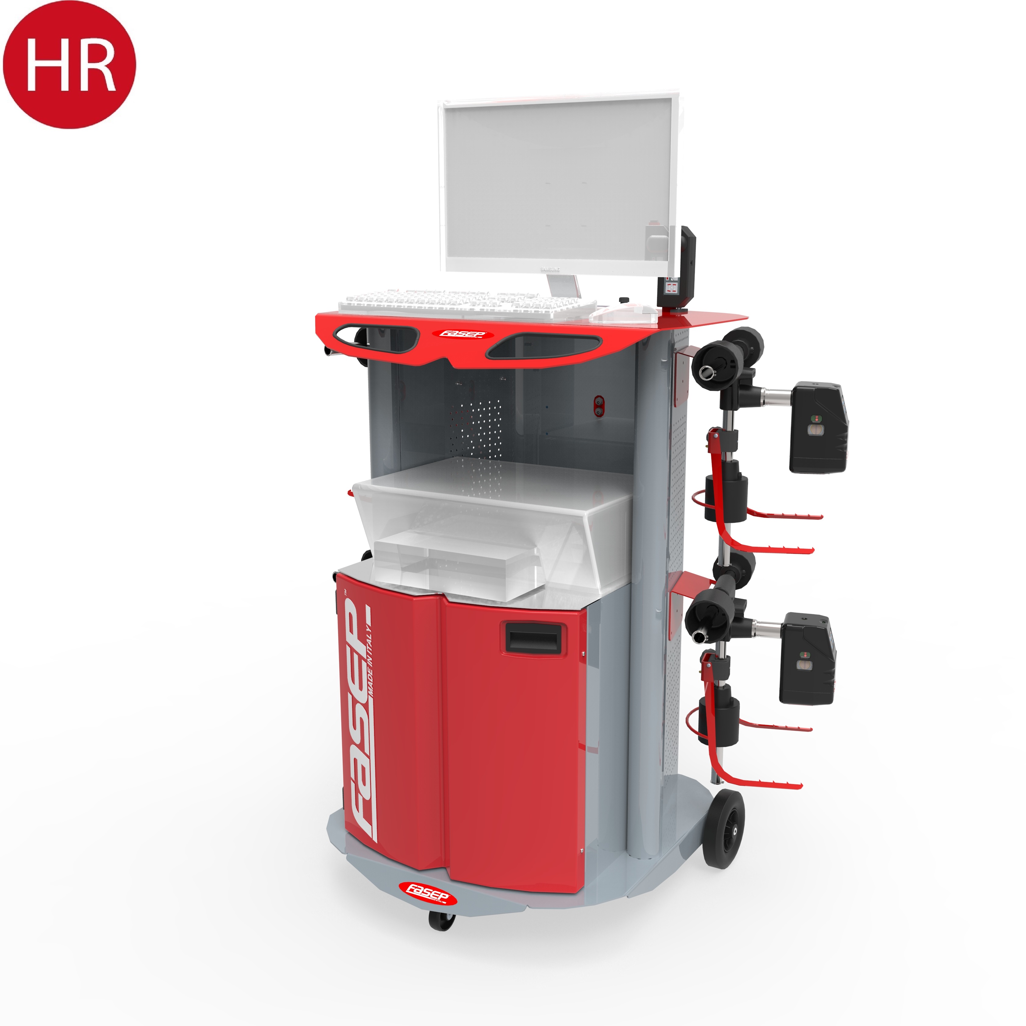 4 Sensori WinTRAX2 (misure infrarosso, trasmissione via radio, sistema Multilink, bolla elettronica con accelerometro). Carica Batterie integrato sul mobile. Aggrappi in appoggio. Asta elettronica per carreggiate. Piatti heavy duty. Telecomando. Bloccasterzo. Bloccafreno.